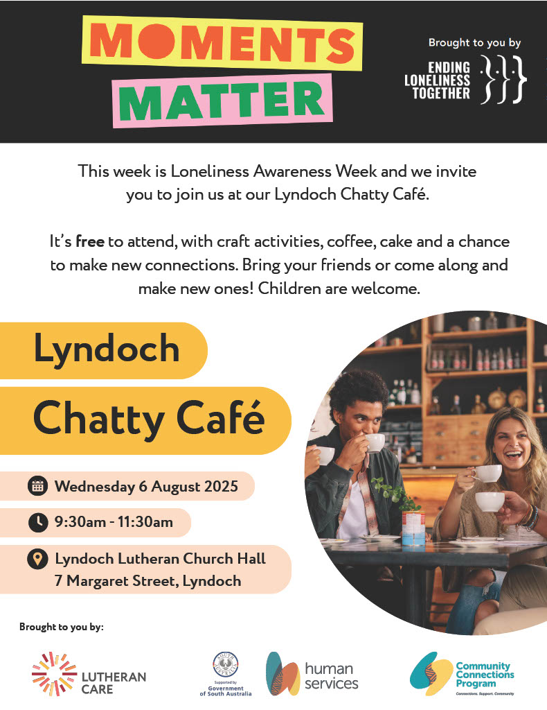 This week is Loneliness Awareness Week and we invite you to join us at our Lyndoch Chatty Café. It’s free to attend, with craft activities, coffee, cake and a chance to make new connections. Bring your friends or come along and make new ones! Children are welcome.