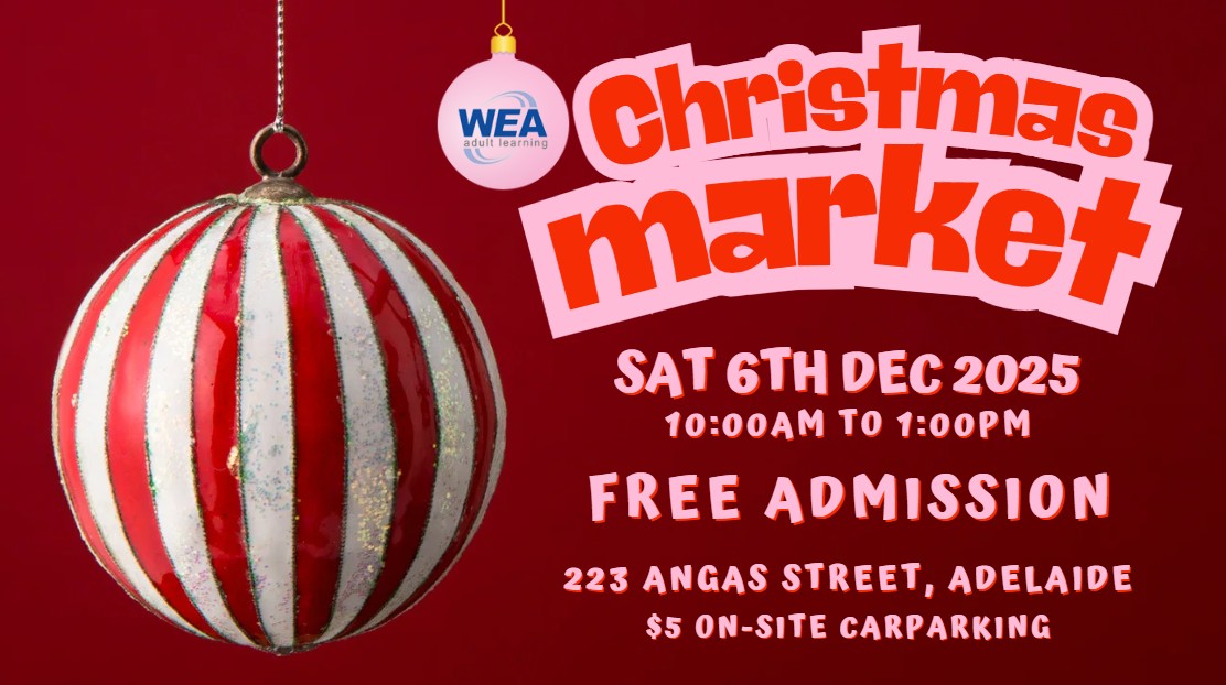 🎄 WEA Christmas Market 2025 📅 Saturday, 6 December 2025 🕙 10:00am – 1:00pm 📍 WEA Centre, 223 Angas Street, Adelaide ✨ Free entry | All ages welcome Step into the festive spirit at the first-ever WEA Christmas Market! Join us for a joyful celebration of handmade creativity, community connection, and Christmas cheer right in […]